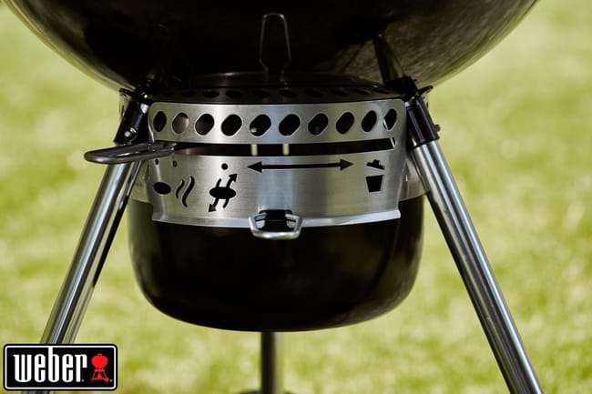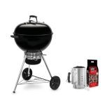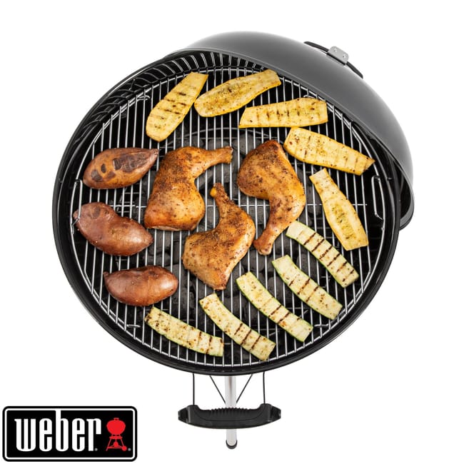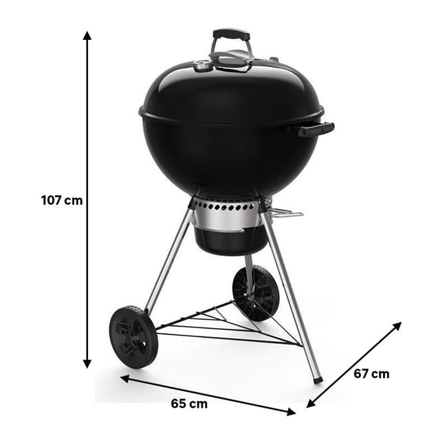 Barbacoa de carbón Weber Dimensiones, tapa abierta (cm) 92cm H x 65cm W x 78cm D, Dimensiones, tapa cerrada (cm) 107cm H x 65cm W x 67cm, Diámetro de la parrilla 57 cm, Peso (kg) 17,5, asa de la cuba y de la tapa en de fibra de vidrio reforzada, Parrilla de cocción articulada con bisagras, Ruedas resistentes para todo tipo de climas, 2 Ganchos portautensilios, reguladores de aluminio resistente al óxido, Termómetro integrado en la tapa y cenicero de acero para contener las cenizas, equipado de sistema de limpieza One Touch. Lleva de regalo un set de encendido Weber ref. 17631, set que se compone de jarra de encendido revestido de aluminio y dos Kg de briquetas de carbón y 3 pastillas de encendido