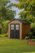 Caseta de jardín fabricada en resina color marrón castaño con puerta doble batiente de cristal y dos ventanas fijas de 56 cm. Incluye suelo y cubierta de polipropileno. Montaje rápido con sistema de tableros ensamblables, ideal para almacenamiento de herramientas, elementos de piscina o como trastero. Se puede cerrar con pestillo para mayor seguridad.