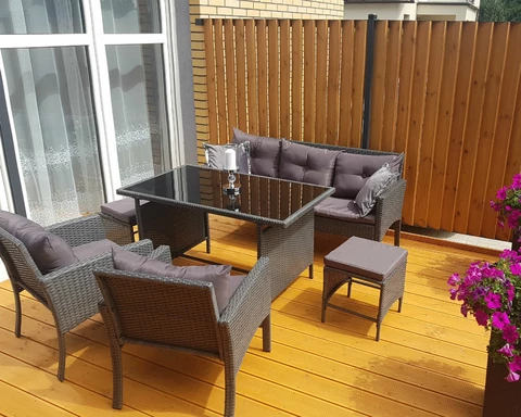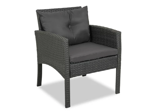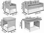 Detalles técnicos Código del producto: GAP121 Numero de asientos: 7 plazas Serie de muebles: Bari Peso (kg): 55 Dimensiones del paquete (cm): 1 x (151x42x73) Número de sillas: 2 dimensiones de la mesa: 120x70x70 (h) cm Dimensiones del sillón: 59,5x66x76(alto) cm dimensiones del sofá: 159 x 66 x 76 (altura) cm Material: Acero Tecnoratán poliéster de 180 g Vidrio templado Color: Antracita Garantizar: 24 meses Altura del asiento (cm): 38 Profundidad del asiento (cm): 52 El conjunto incluye: – sofá de tres plazas – 2 sillones – 2 pufs – Mesa del comedor – Cojines de respaldo y asiento Dimensiones del puf: 37,5×37,5×38 (alto) cm El color de las almohadas.: gris EAN: 5903981508174 Grosor del cojín: 5 cm Destino: Día festivo Cena Instalación: independiente Tipo de trenza: departamento Cojines incluidos: asiento y respaldo Tipo de mesa: vaso Agujero de paraguas: NO Apilado: NO Sillas plegables: NO
