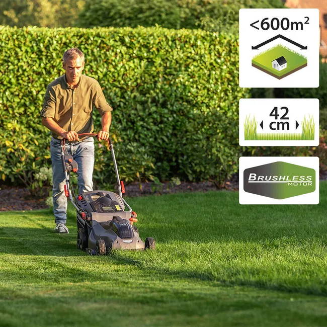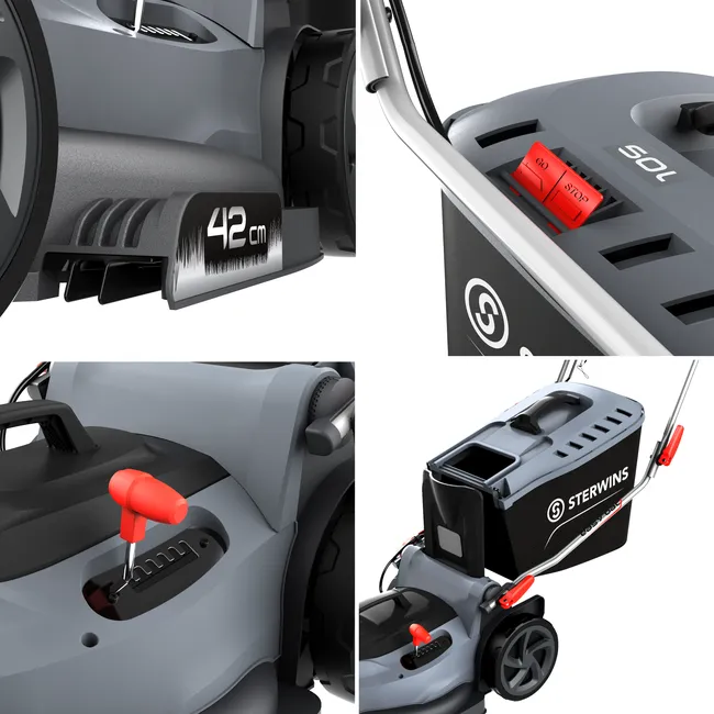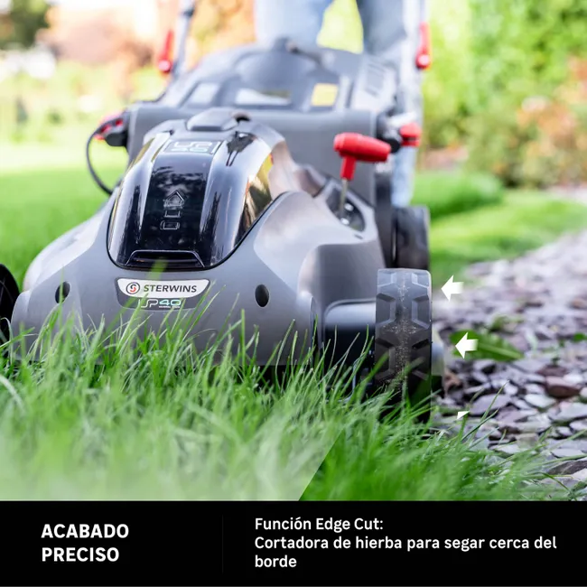 Cortacésped de batería inalámbrico Sterwins UP40 de 42 cm. Es ideal para mantener un césped de 450 m² con una sola carga de batería. Su ancho de corte de 42 cm y el ajuste central de la altura de corte (4 posiciones, de 3 cm a 6 cm) le permiten segar de manera eficiente y adaptarse a todos los céspedes. Ligera y fácil de manejar, también ofrece un agarre muy cómodo gracias a su manillar ergonómico, regulable en altura y recubierto de espuma protectora. Fácil de comenzar simplemente presionando el botón de inicio. Es fácil de guardar y ocupa poco espacio, gracias a su manillar abatible y bandeja semirrígida. Trabaje de forma autónoma y sin restricciones con esta máquina inalámbrica, alimentada con tecnología de batería de iones de litio que no emite emisiones contaminantes durante su uso. Su motor «Brushless», sin carbono, ajusta automáticamente el nivel de potencia según los requerimientos del tipo de césped a cortar. Adecuado para su uso en áreas sensibles al ruido cerca de los hogares. La plataforma UP40 consiste en una sola batería para recortar, segar, desbrozar, cortar, podar y soplar… tu mejor aliado para mantener tu jardín con tranquilidad. Para una mejor durabilidad, se recomienda mantener la batería a una temperatura que oscile entre 4° y 24° grados y una tasa de carga entre 25% y 50%. No olvides reciclar tus baterías. Productos de calidad Sterwins: 3 años de garantía, vida útil comprobada y muchas piezas de repuesto disponibles.