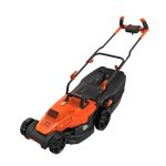 Cortacésped eléctrico Black & Decker BEMW471BH-QS de 1.600 W de potencia y un ancho de corte de 38 cm. El chasis dispone de unos peines laterales que ejercen la función de cortabordes. Sus 6 alturas de corte se regulan de forma centralizada. La eyección del césped es trasera. Incorpora bolsa de recogida rígida con una capacidad de 45 litros muy fácil de vaciar y avisador de llenado del recogedor; además de un asa de transporte para moverlo de manera fácil y cómoda. Su manillar es plegable para facilitar el almacenaje y dispone de una empuñadura ergonómica con doble mando buscando que las muñecas estén en una posición natural durante el uso. Dispone de un sistema que evita que se enrede el cable. Esta herramienta está especialmente indicada para un uso en jardines de superficie sin pendiente ni obstáculos de hasta 400 m².