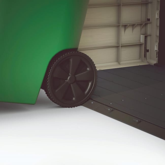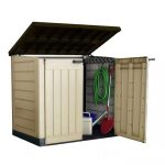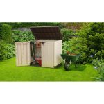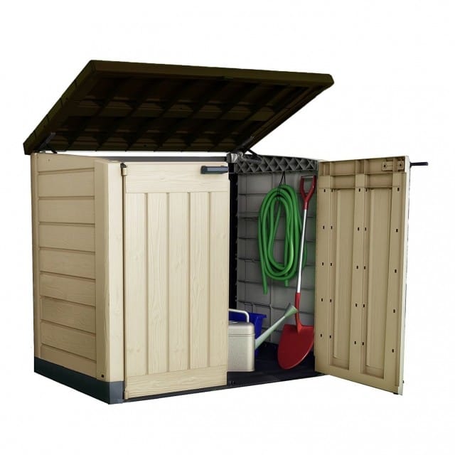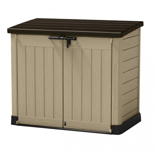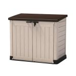 – Portaherramientas de resina, cerrable con candado, apertura de tapa con pistones – cm. 145,5x82x125h – 1200 lt – beige.