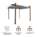 Pérgola rectangular Naterial Odyssea con estructura de aluminio gris oscuro y cubierta de aluminio, que protege de la lluvia y los rayos del sol, permitiendo el máximo aprovechamiento de la luz natural.Se fija al suelo gracias a la tornillería que suministra con la pérgola. Cubre una superficie de 10,69 m². Su sistema antivientos le proporciona mayor estabilidad a la estructura. Este producto es reparable y tiene una garantía de 3 años; ponte en contacto con el servicio posventa de tu tienda para obtener más detalles. Medidas: 320 x 260 x 358 cm (ancho x alto x largo).