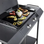 Plancha de gas Naterial fabricada en fundición, con 2 quemadores de acero inoxidable y tapa de acero. Cuenta con 6 kW de potencia y está indicada para reuniones de hasta 10 comensales. Ruedecillas para un mejor transporte. Recogegrasas integrado y funda incluida. Tiene encendido electrónico y funciona tanto con gas propano como butano. Medidas: 110,5 x 91 cm (ancho x alto).
